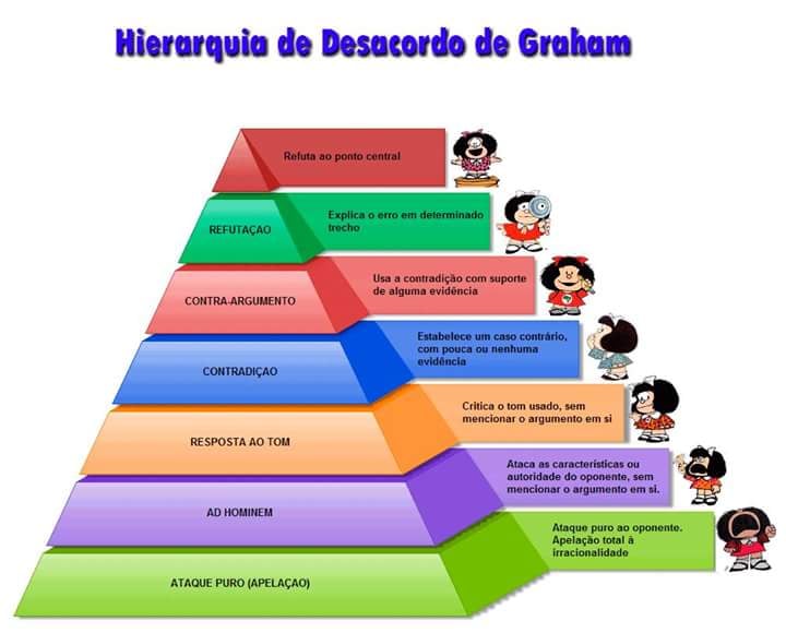Nesse contexto, podemos recorrer a um modelo muito útil para entender como os debates se degeneram: a Pirâmide do Desacordo, de Paul Graham. No topo da pirâmide, reside o nível mais nobre do debate, a refutação, onde os argumentos são combatidos com argumentos. É o reino do convencimento. No entanto, quando falhamos em nossas refutações, nossa frustração nos leva a descer pela pirâmide, passando por ataques à pessoa do oponente e xingamentos. Nesse ponto, o objetivo não é mais convencer, mas simplesmente vencer a discussão, mesmo que seja pela força verbal.